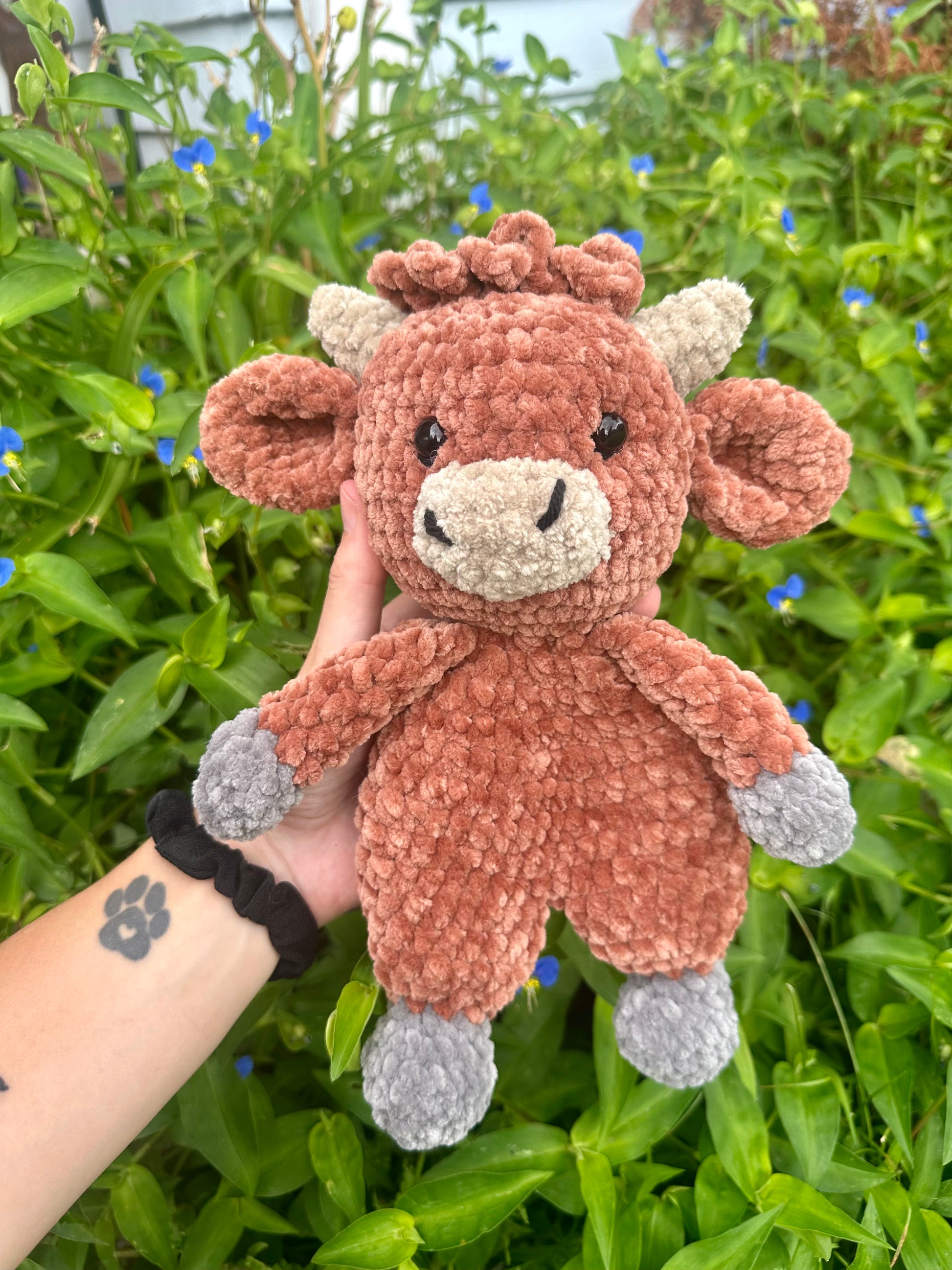 This adorable baby highland cow snuggler is ready for his new home and to be cuddled up with someone. He is extra soft and extra cuddly.